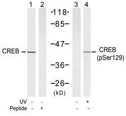 Western blot analysis of extracts from 293 cells untreated or treated with UV, using CREB Antibody (S129) (APR00473G, Lane 1 and 2) and Phospho-CREB-S129 Antibody ( Lane 3 and 4). |