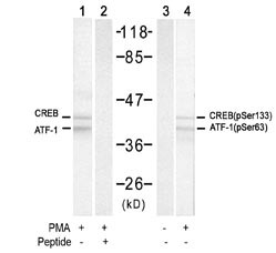 Western blot analysis of extracts from HeLa cells using CREB Antibody (S133) (APR00474G, Lane 1 and 2) and CREB (phospho-Ser133) antibody ( Lane 3 and 4).