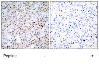 Immunohistochemical analysis of paraffin-embedded human breast carcinoma tissue using CREB Antibody (S133) (APR00474G). |