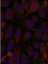 Immunofluorescence staining of methanol-fixed HeLa cells using Phospho-GATA1-S142 Antibody (APR00477G, Red). |