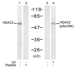 Western blot analysis of extracts from HT-29 cells untreated or treated with UV (20min), using HDAC2 Antibody (S394) (APR00479G, Lane 1 and 2) and Phospho-HDAC2-S394 Antibody (Lane 3 and 4).