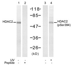 Western blot analysis of extracts from HT-29 cells untreated or treated with UV (20min), using HDAC2 Antibody (S394) (Lane 1 and 2) and Phospho-HDAC2-S394 Antibody (APR00480G, Lane 3 and 4).