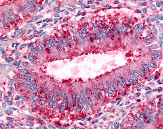 Anti-DPP8 antibody APR02076G IHC of human uterus, endometrial glands. |