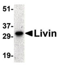 Western blot of Livin expression in human Raji cell lysate with Livin antibody at 0.5 ug/ml.
