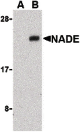 Western blot of NADE in Human brain cell lysates with NADE antibody at 1 ug/ml in the presence...