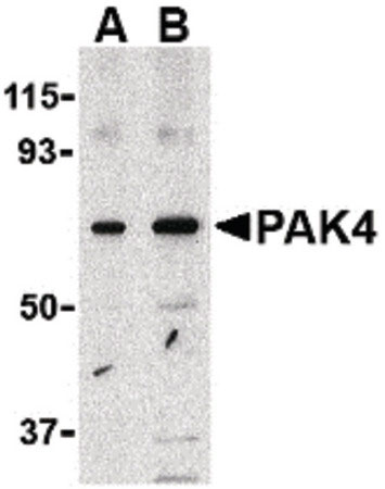 Western blot of PAK4 in SW480 lysate with PAK4 antibody at (A) 1 and (B) 2 ug/ml.