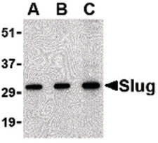 Western blot of Slug in 293 cell lysate with Slug antibody at in (A) 0.5, (B) 1 and (C) 2 ug/ml.