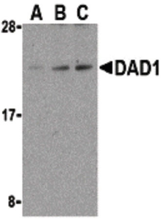 Western blot of DAD1 in HepG2 cell lysate with DAD1 antibody at (A) 0.5, (B) 1, and (C) 2 ug/ml. |