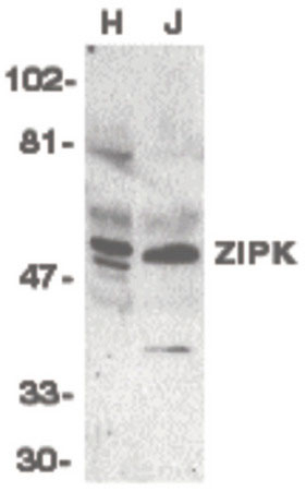 Western blot of ZIP kinase in HeLa (H) and Jurkat (J) whole cell lysates with ZIP kinase... |