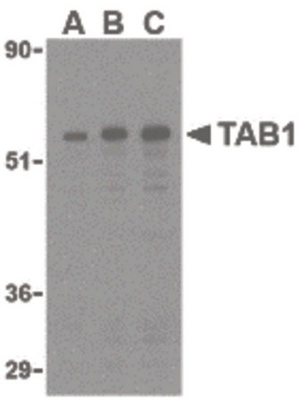 Western blot of TAB1 in 3T3 cell lysate with TAB1 antibody at (A) 0.5, (B) 1, and (C) 2 ug/ml. |
