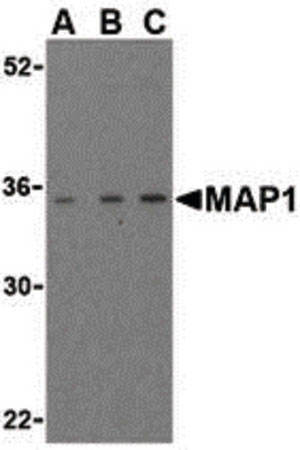 Western blot of MAP-1 in EL4 cell lysate with MAP-1 antibody (IN) at (A) 1, (B) 2, and (C) 4 ug/ml.