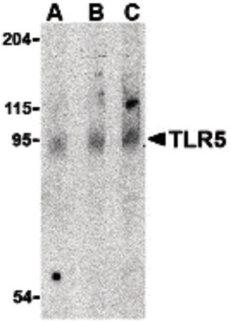 Western blot of TLR5 in rat brain cell lysate with TLR5 antibody at (A) 0.5, (B) 1 and (C) 2 ug/ml.