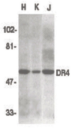 Western blot of DR4 in HeLa (H), K562 (K), and Jurkat (J) whole cell lysate with DR4 antibody at...