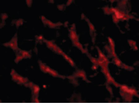 Immunofluorescence of Fn14 in Human Liver cells with Fn14 antibody at 20 ug/ml.