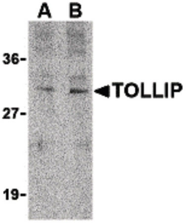 Western blot of TOLLIP in rat brain cell lysate with TOLLIP antibody at (A) 1 and (B) 2 ug/ml.