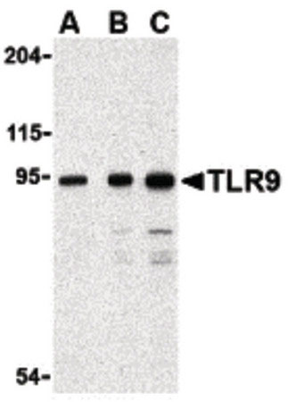 Western blot of TLR9 in Jurkat cell lysate with TLR9 antibody at (A) 0.5, (B) 1 and (C) 2 ug/ml. |