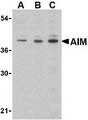 Western blot of AIM in Raji lysate with AIM antibody at (A) 0.5, (B) 1 and (C) 2 g/ml. |