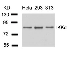 Western blot of extracts from HeLa, 293 and 3T3 cells using IKK a(Ab-23) antibody.