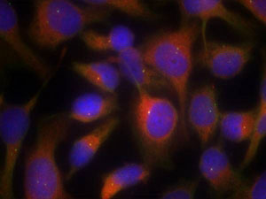 Immunofluorescence staining of methanol-fixed HeLa cells using Myosin Light Chain 2(Ab-18) antibody.