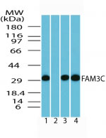 Western blot of human FAM3C in human brain lysate (0.5 ug/ml) 1) absence, 2) presence of...