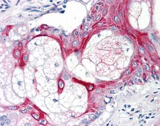 Anti-CD55 antibody IHC of human skin, pilosebaceous unit. |