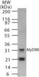 Western blot of MyD88 in human spleen cell lysate using 0.5 ug/ml of antibody.