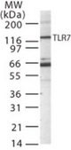 KLH-conjugated synthetic peptide corresponding to amino acids 706-728 of human TLR7. It will cross-react with mouse TLR7. In human Ramos cells, additional bands are seen.