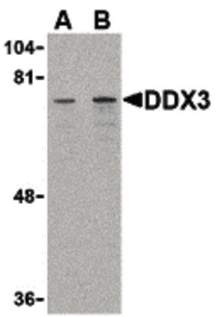 Western blot of DDX3 in HepG2 cell lysate with DDX3 antibody at (A) 1 and (B) 2 ug/ml. |