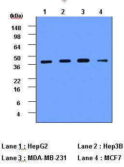 Cell lysates of HepG2, Hep3B, MDA-MB-231 and MCF7 (each 20 ug) were resolved by SDS-PAGE,... |