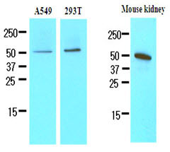Cell lysates of A549, 293T and mouse kidney (35 ug) were resolved by SDS-PAGE, transferred to NC... |