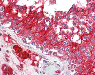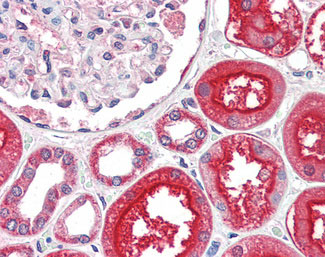 Immunofluorescence of ACE2 in Human Kidney cells with ACE2 antibody at 10 ug/ml.