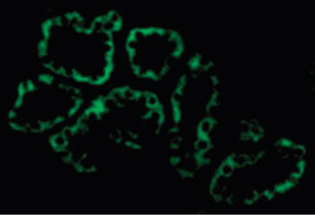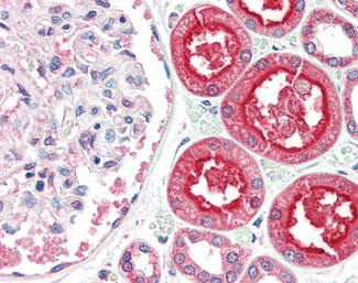 Immunofluorescence of ACE2 in Human Kidney cells with ACE2 antibody at 2 ug/ml.