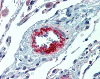 Anti-IL-23 p19 antibody IHC of human lung, vasculature.