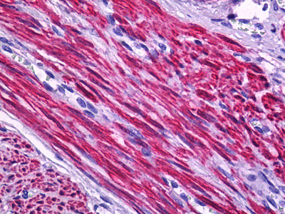 Anti-CNN1 / Calponin antibody IHC of human prostate, smooth muscle. |