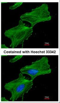 Immunofluorescence of methanol-fixed HeLa, using Beta actin antibody at 1:300 dilution.