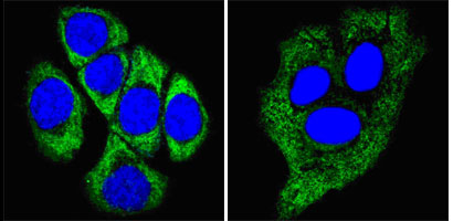 Confocal immunofluorescence of methanol-fixed ECA109 cells (left) and HepG2 cells (right) using...