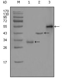 Western blot using PEG10 mouse monoclonal antibody against truncated Trx-PEG10 recombinant...