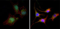 Immunofluorescence of A549 (left) and SK-BR-3 (right) cells using CTNNB1 mouse monoclonal... |