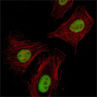 Immunofluorescence of HeLa cells using Pirh2 mouse monoclonal antibody (green).