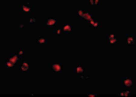 Immunofluorescence of PDCD5 in Jurkat cells with PDCD5 antibody at 10 ug/ml.