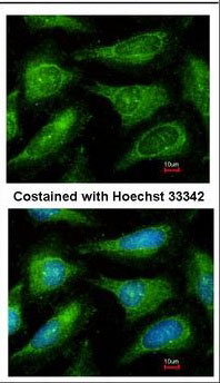Immunofluorescence of methanol-fixed HeLa, using c-Yes antibody at 1:200 dilution.