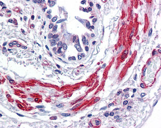 Anti-ACTA1 / ASMA antibody IHC of human lung, bronchial smooth muscle. |