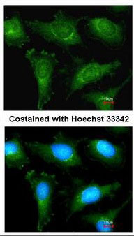 Immunofluorescence of methanol-fixed HeLa, using alpha Actinin 2 antibody at 1:200 dilution.