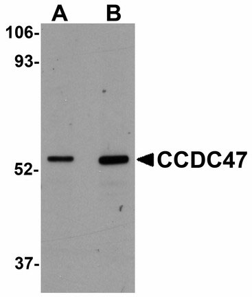 Western blot of CCDC47 in mouse heart tissue lysate with CCDC47 antibody at (A) 1 and (B) 2 ug/ml.