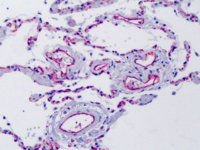 Anti-CD31 antibody IHC of human lung, endothelium. |