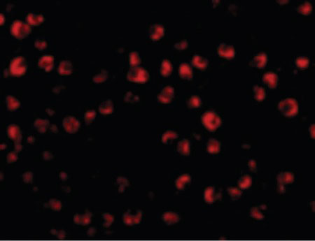 Immunofluorescence of OTUD4 in Daudi cells with OTUD4 antibody at 20 ug/ml.