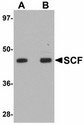 Western blot of SCF in rat brain tissue lysate with SCF antibody at (A) 1 and (B) 2 ug/ml.