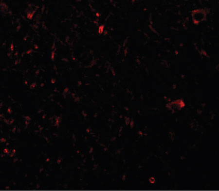 Immunofluorescence of PLKHM3 in human brain tissue with PLKHM3 antibody at 20 ug/ml.