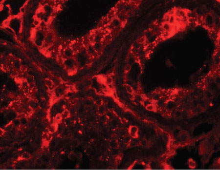 Immunofluorescence of INCA1 in human testis tissue with INCA1 antibody at 20 ug/ml.