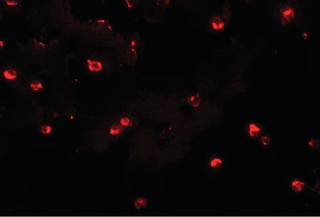 Immunofluorescence of ENC-2 in Jurkat cells with ENC-2 antibody at 20 ug/ml.
